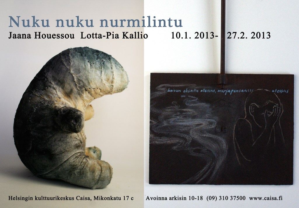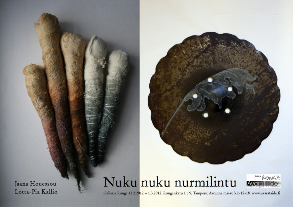 Nuku nuku nurmilintu (Sleep sleep grassland bird) -exhibition deals with experiencing of (domestic)violence, as well as the management and improvement . The cloth protects and covers, conceals a secret. It supports and gives strength . The wrapper can also be dominant, suffocating. Wrapping and unloading ritual is also interesting; accumulating in layers around the core material gives an indication of the form, but conceal the details.